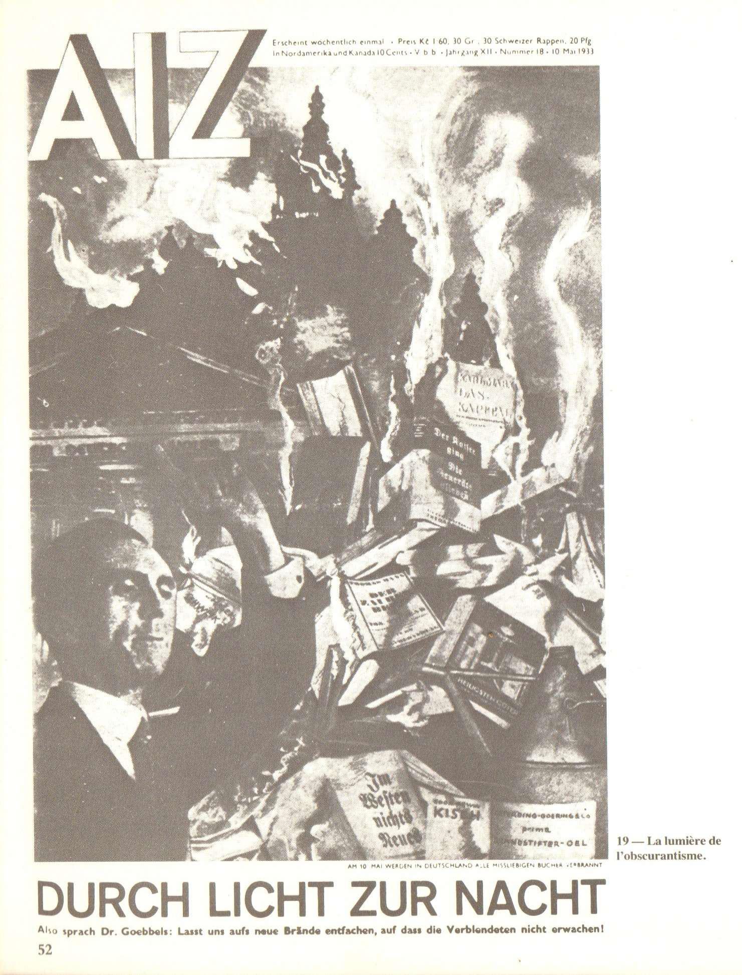 – p. 52 – La lumière de l’obscurantisme – Éléments historiques : Les autodafés de livres du 10 mai 1933, à Berlin et dans 21 autres villes allemandes, sont un point culminant des persécutions visant les écrivains pacifistes, marxistes ou juifs. Des dizaines de milliers de livres sont brûlés par des étudiants, enseignants et membres du parti nazi (n° 18, p. 321, de 1933) – Cf. CHAUVET Didier, Les autodafés nazis, mémoire du 10 mai 1933, Paris, L’Harmattan 2017 ; RICHARD Lionel, Le nazisme et la culture, éd. Complexe 2006 ;