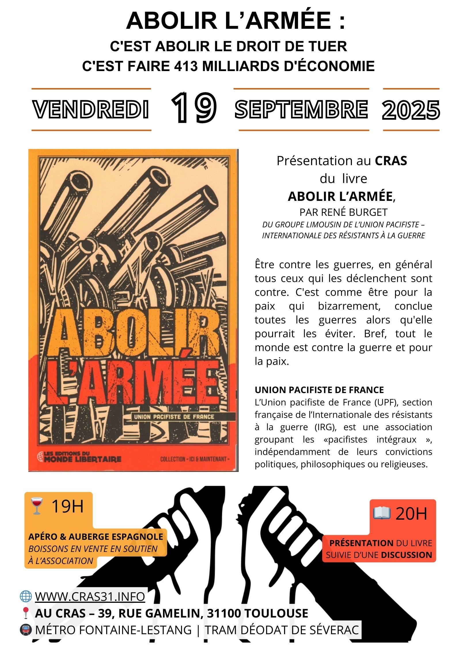 Le CRAS vous invite le 19 septembre 2025 à une présentation du livre abolir l’armée aux éditions libertaires