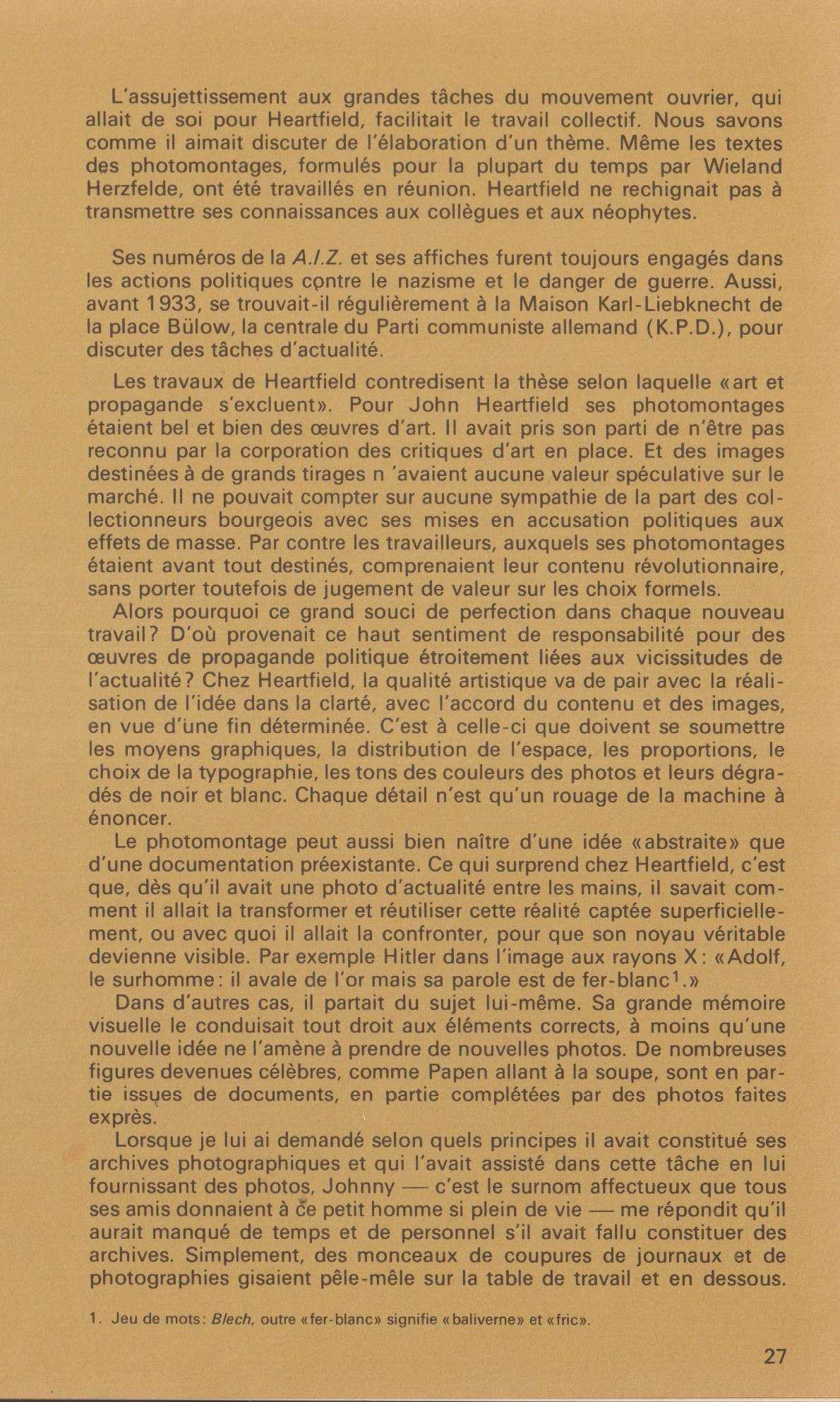 « […] Lucien Vogel est un homme qui compte dans la presse française. Pour « inventer » Vu, un magazine novateur, il s’est inspiré de la maquette, des contenus et du « chemin de fer » [Il s’agit d’une « carte routière » qui va guider la création du magazine, un « plan visuel » détaillé qui va prévoir l’emplacement de chaque élément, de la typographie à la mise en page, en passant bien entendu pat les photos.] rédactionnel de l’Arbeiter Illustrierte Zeitung ♪, l’un des titres prestigieux de Münzenberg à Berlin. […] Sa couverture de l’actualité est d’une étonnante modernité, son information diversifiée, éclectique, aborde la politique par les moyens de reportage de terrain […] Sous la direction artistique d’Alexandre Liberman [Alex Liberman (1912 à Kiev – 1999 à Miami), artiste pluridisciplinaire et durant 32 ans à la direction artistique du magazine Vogue.], la photo est devenu d’un usage constant à Vu […]. Le recours à l’héliogravure permet une reproduction soignée des images, la mise en page recherchée présente, non sans audace, les clichés des maîtres de la photographie de l’entre-deux-guerres, André Kertesz, Robert Capa, Henri Cartier-Bresson, Germaine Krull, Marcel Ichac, Brassaï, Man Ray, Gerda Taro, inventeurs du photoreportage ... » (pages 337/ 340, in Willi Münzenberg – Artiste en révolution (1889-1940) d’Alain Dugrand et Frédéric Laurent, Fayard 2008). Voir aussi Denoyelle Françoise, La lumière de Paris – Les usages de la photographie 1919-1939, tome 2, L’Harmattan 1997 ; Fontaine François, La guerre d’Espagne, un déluge de feu et d’images, BDIC – Berg International 2003 ; Leenaerts Danielle, Petite histoire du magazine Vu (1928-1940) – Entre photographie d’information et photographie d’art, Peter Lang 2010 ; Willett John, Heartfield contre Hitler, Fernand Hazan 1997 ; Zervigón Andrés Mario, The Proletarian Image between Political Agitation and Realistic Sobriety – The Arbeiter Illustrierte Zeitung and the German worker photography movement, Transbordeur n°4 (2020) ...