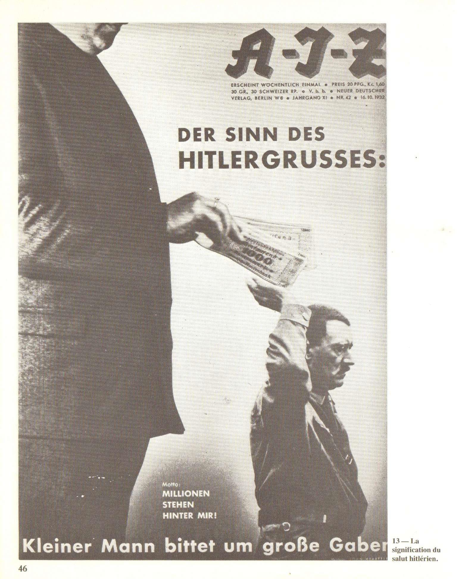 – page 46 – La signification du salut hitlérien – Texte : Il y a des millions derrière moi ! Le petit homme demande de grands cadeaux (n° 42, page 985, publié en 1932) ;