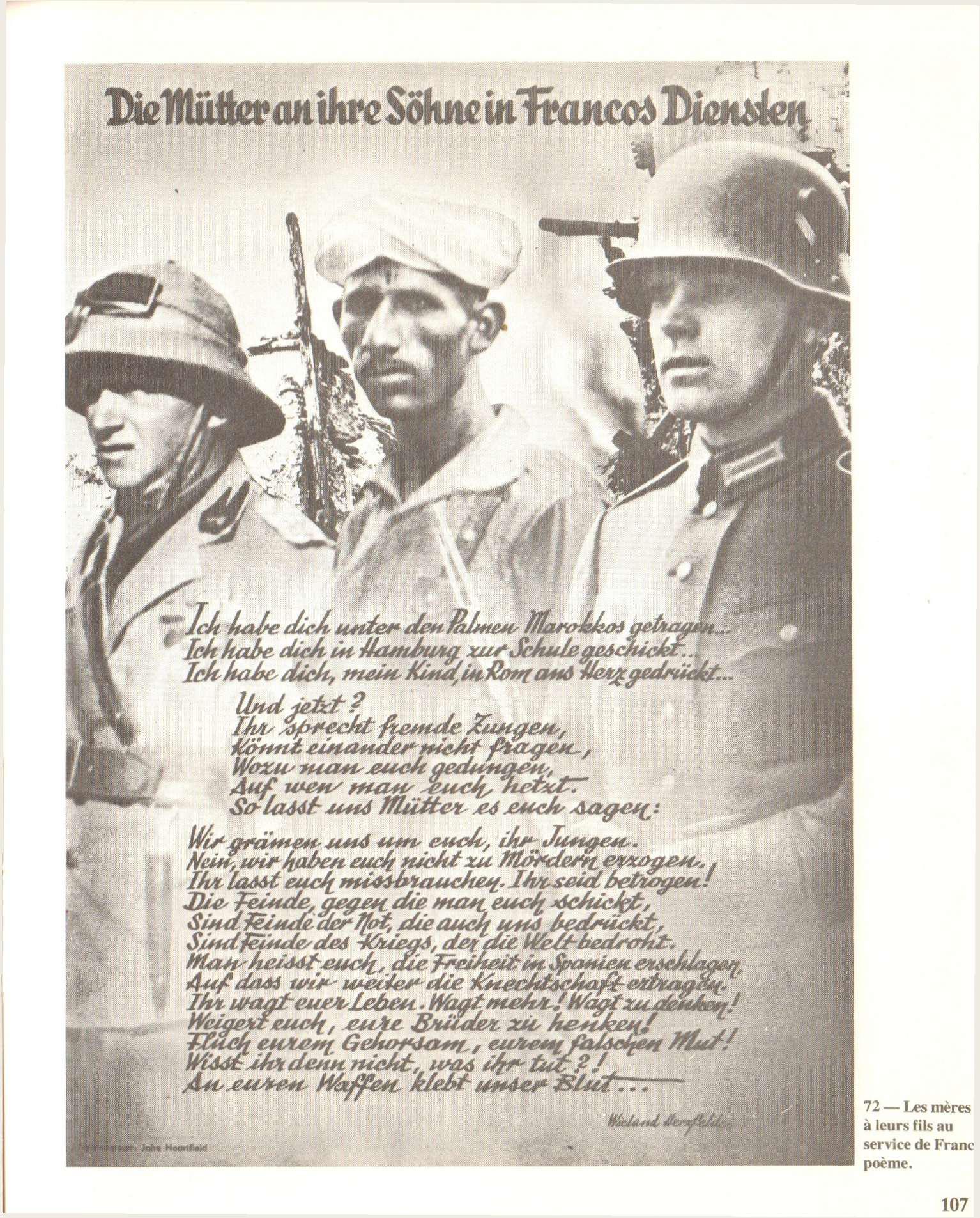 – p. 107 – Les mères à leurs fils au service de Franco (poème) – Texte : Je t’ai porté sous les palmiers du Maroc, je t’ai envoyé à l’école à Hambourg, je t’ai serré sur mon cœur à Rome, mon enfant … Et maintenant ? Vous ne savez même pas contre qui on cous fait combattre. Alors, nous les mères, laissez-vous vous dire … vous ne savez donc pas ce que vous faites ? Sur vos armes c’est notre sang qui est collé – EH : Environ 60 000 Marocains, 50 000 Italiens et 16 000 Allemands combattent avec Franco … (n° 19, p. 301, de 1936) ;