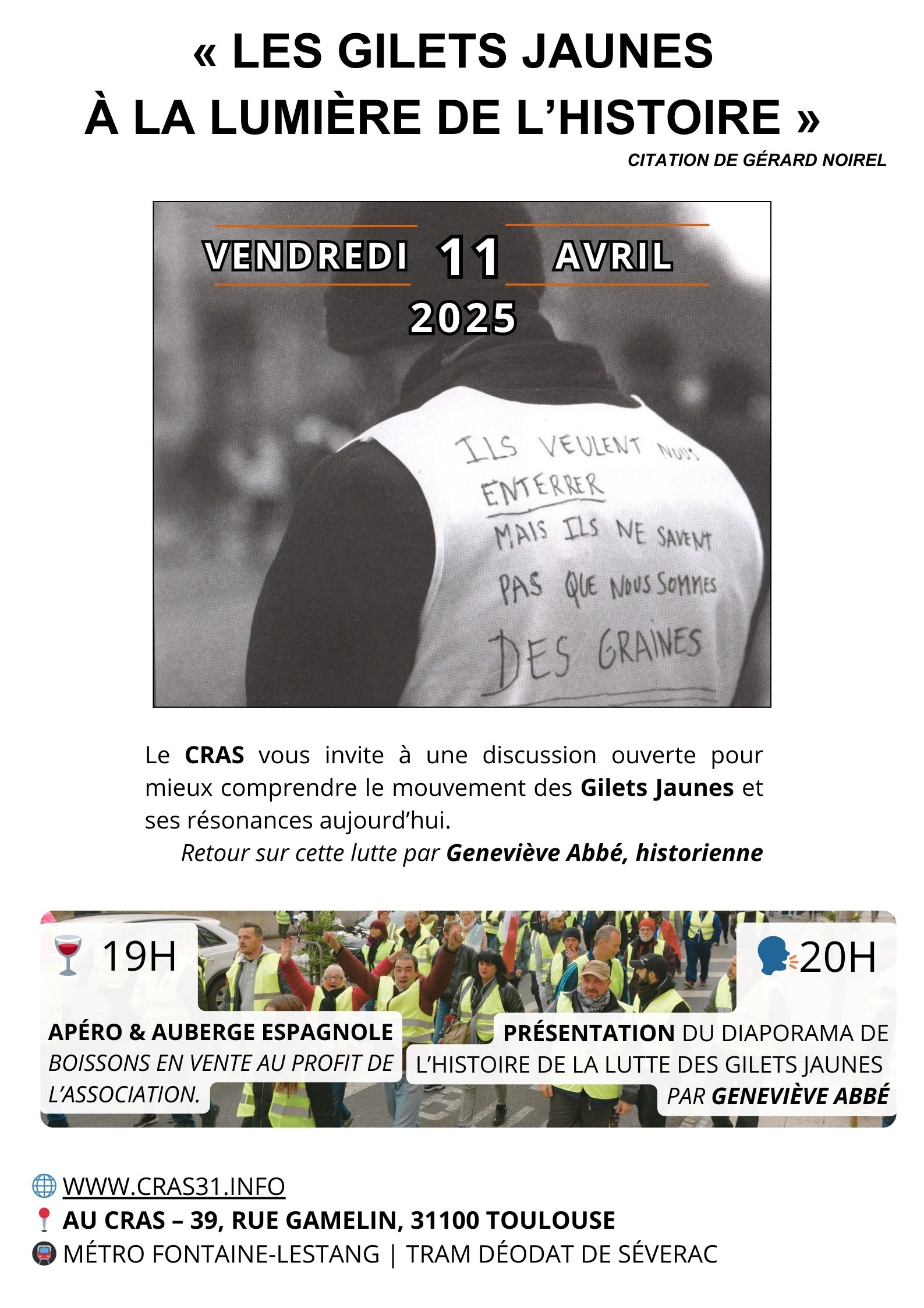 Le CRAS vous invite le 11 avril 2025 à une discussion ouverte pour mieux comprendre le mouvement des Gilets Jaunes et ses résonances aujourd’hui.